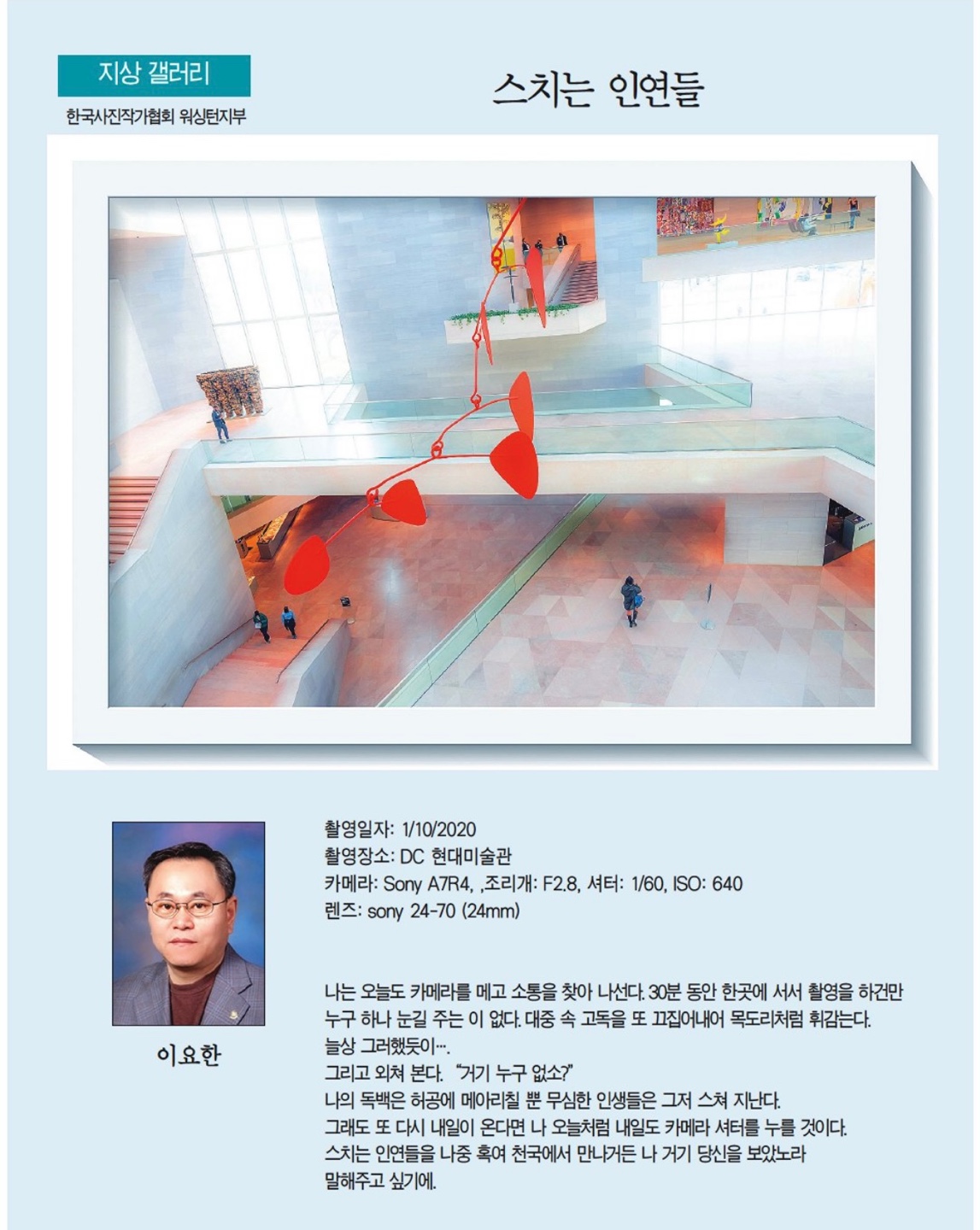 | 1 | 수십억년을 기록한 암벽의 예술과 유유히 흐르는 강. 이기우. 11/30/23 | 12/3/2023 |
