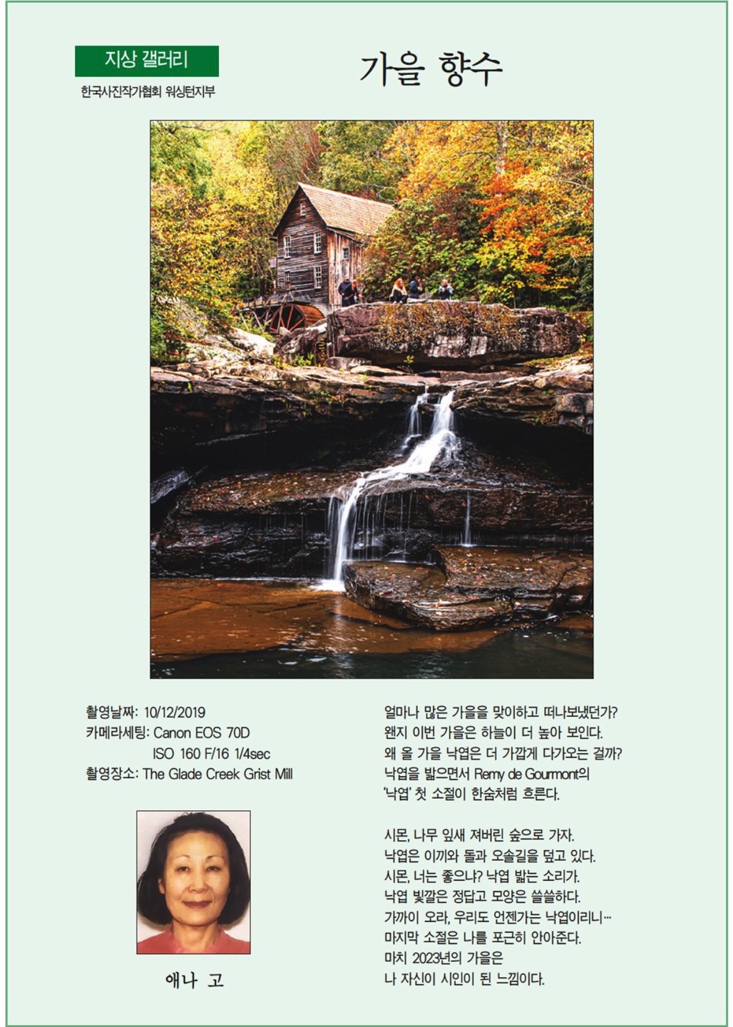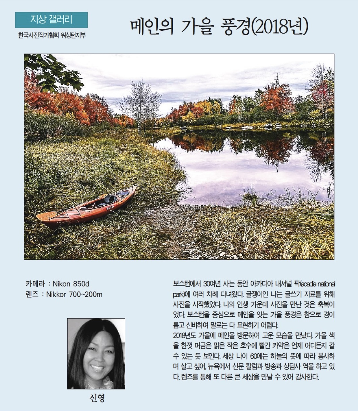 | 15 | 메인의 가을 풍경(2018년). 신 영. 8월 10일 2023년. 한국일보 | 9/23/2023 |