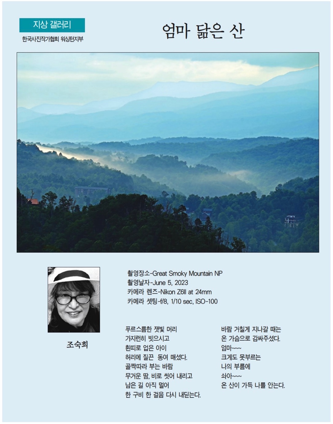 | 10 | 엄마 닮은 산. 조숙희.9월 14일 2023년. 한국일보 | 9/23/2023 |