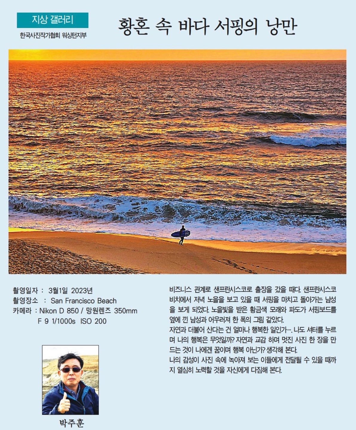 | 7 | 황혼 속 바다 서핑의 낭만. 박주훈. 6월 15 일 2023년. 한국일보 | 9/23/2023 |